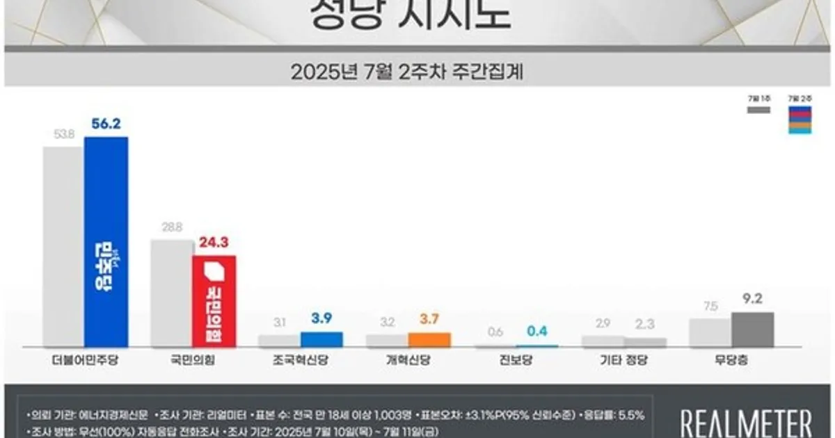 민주 56.2% 국힘 24.3%…민주 2.4%p↑ 국힘 4.5%p↓[리얼미터]