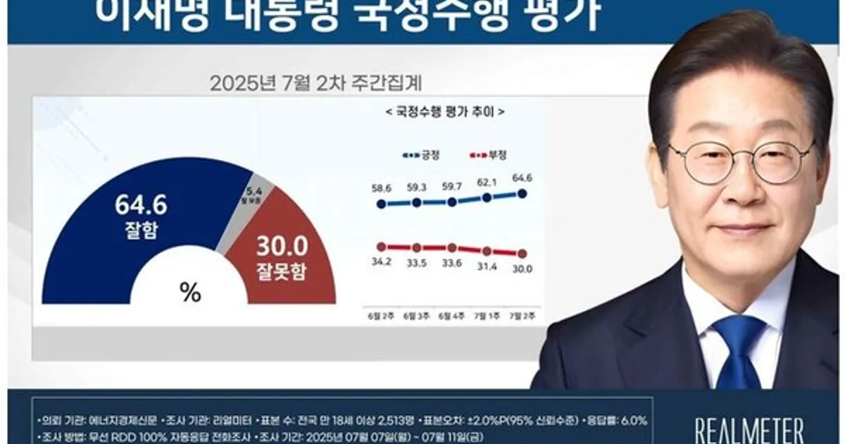 이 대통령 국정수행 '잘한다' 64.6%·'잘못한다' 30.0%[리얼미터]